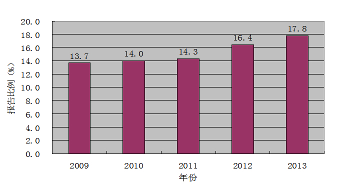 按报告涉及患者年龄统计,14岁以下儿童的报告占10.6%,与2012年基本一致,65岁以上老年人的报告占17.8%,较2012年升高了1.4个百分点。