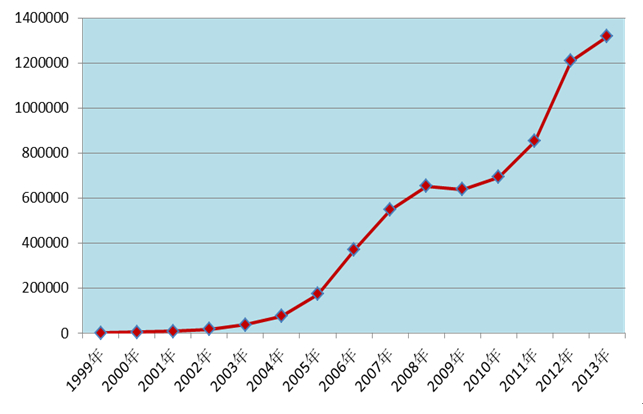 图1 1999-2013年全国药品不良反应/事件报告数量增长趋势