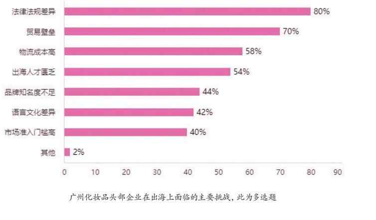 但是,出海之路仍然任重道远。大部分化妆品企业在海外市场的销售额占总销售额的比例并不高,企业出海依然面临不少挑战。其中,法律法规差异(占比80%)、贸易壁垒(占比70%)、物流成本高(占比58%)、出海人才匮乏(占比54%)等方面较为突出,品牌知名度不足、语言文化差异、市场准入门槛高也被部分企业所提及。