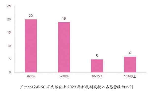 充足的资金及高素质的人才是支撑企业创新的动力。接受问卷调查的样本中,2023年科技研发投入占总营收的比例10%以上的广州化妆品头部企业占比22%,集中在0%-5%和5%-10%区间的企业数量分别占比40%和38%。
