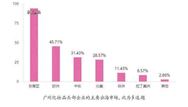 从《白皮书》问卷调查来看,当前,70%的广州化妆品头部企业样本都有出海业务。其中,东南亚市场最受企业青睐,占比约94%,其次是欧洲、中东和北美市场,企业布局占比分别约为46%、31%和29%。非洲和拉丁美洲市场的比例较低,分别为11%和9%。